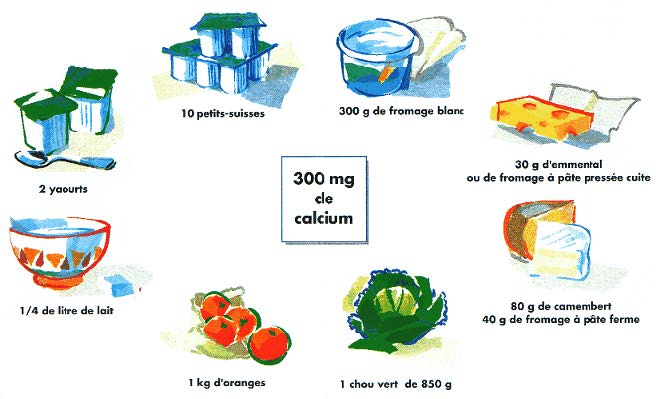 Les légumes, les fruits, les céréales et les eaux de boisson (une eau riche en calcium contient au moins 150mg de calcium/litre) complètent les apports en calcium du lait et des produits laitiers.
