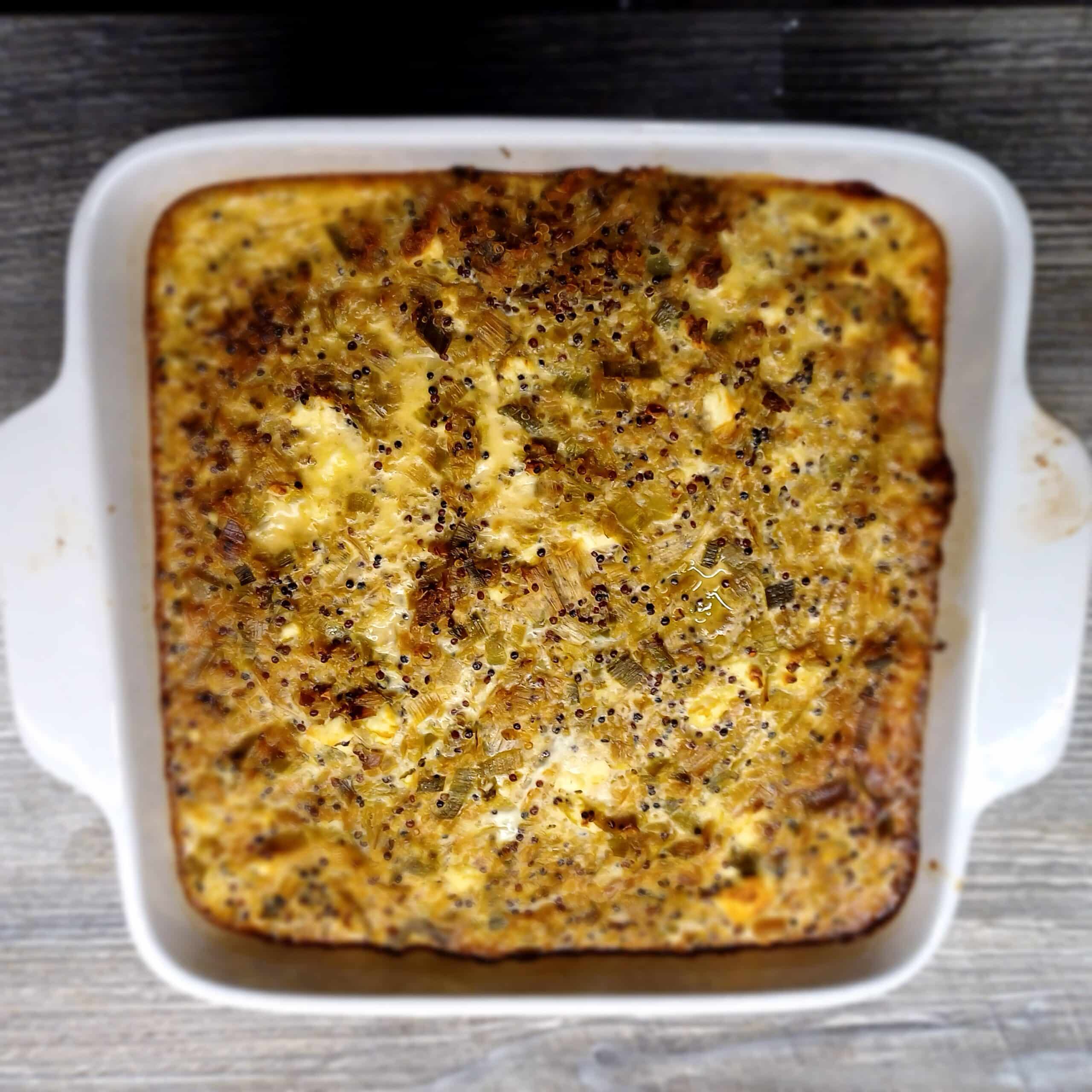 Ajouter dans le quinoa-poireaux au mélange œuf -lait, poivrer et saler si besoin et ajouter la feta émiettée.