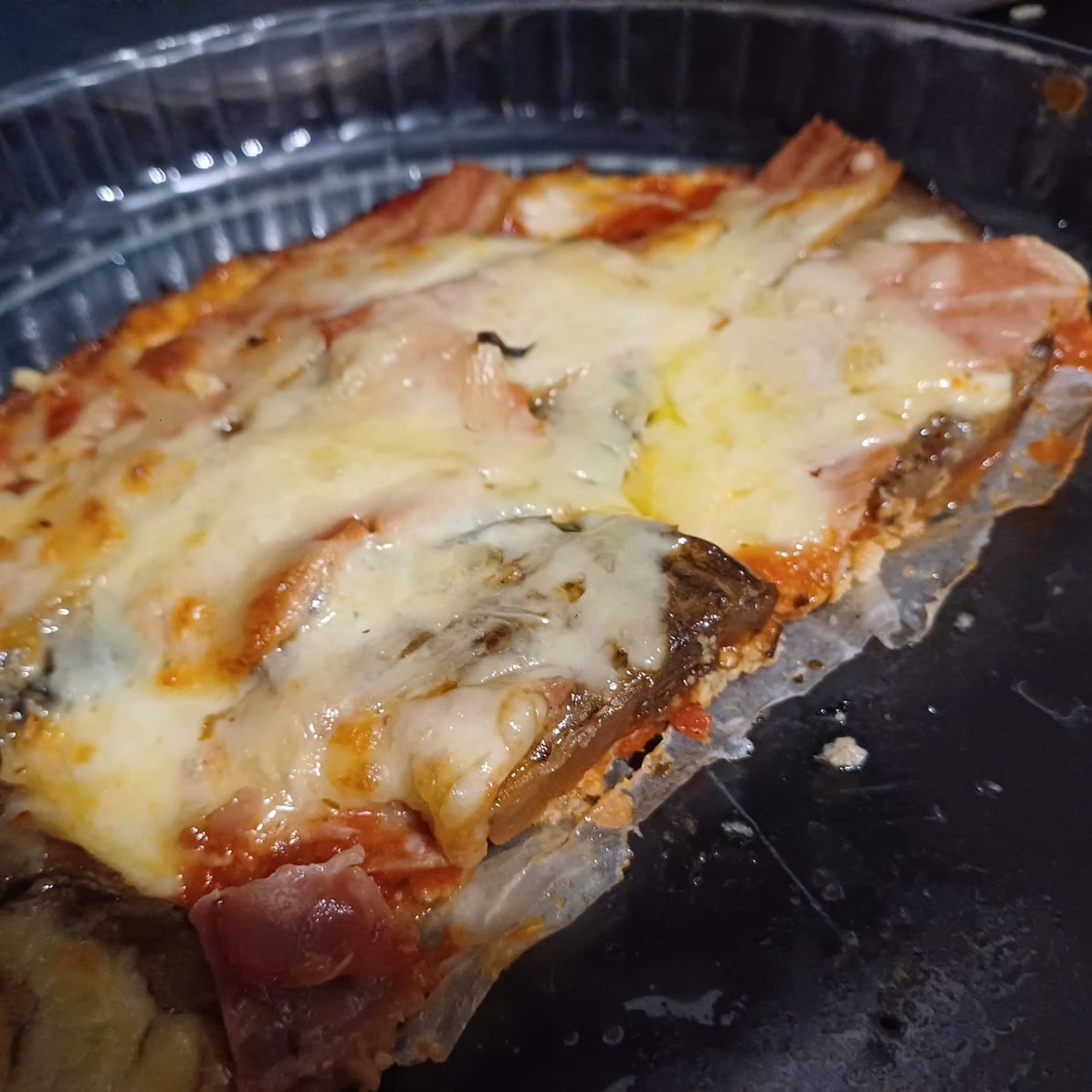 Sortir la pate du four et étaler la sauce tomate . Mettre les tranches d'aubergines , le jambon ou le bacon végétal. Terminer par la mozzarella coupé en petits morceaux éparpillés sur la pizza . Enfourner 20 mn dans un four à 200°. il n'y a plus qu'à déguster.